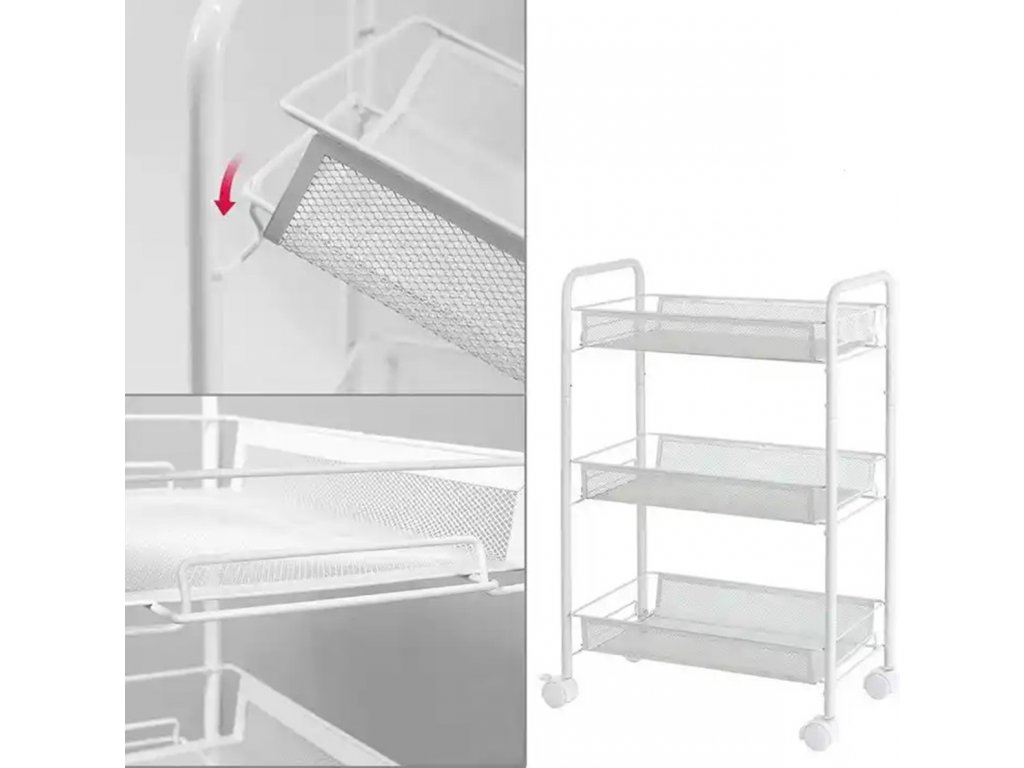 Univerzálna, pojazdná kuchynská polica na kolieskach. Vybavený tromi hlbokými policami na uloženie mnohých doplnkov. Ďalších päť odnímateľných háčikov umožňuje pohodlné zavesenie handričiek alebo uterákov na okraje kočíka. Jeden pár koliesok má brzdy, ktoré umožňujú jeho aretáciu a umiestnenie kdekoľvek. Neuveriteľné množstvo aplikácií vďaka mobilnému dizajnu.