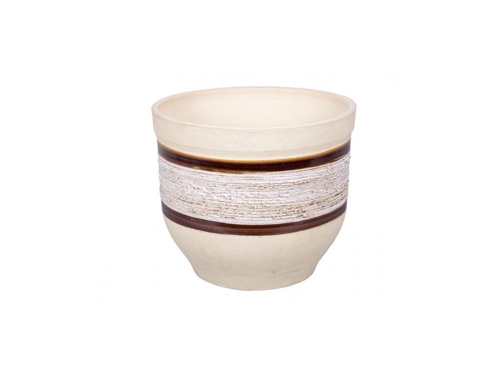 Keramický béžový črepník so zdobením po obvode v 2/3 výšky. Vedú tu 2 hnedé glazované cca 1cm široké prúžky, medzi ktorými je bielo glazovaný pruh tvorený nepravidelnými vrypmi vedenými po obvode. Kvetník má užšiu základňu, potom sa prudko roztvorí a stáva sa takmer pravidelným valcom zakončeným vystúpenejším lemom. Kvetník je vhodný do interiéru aj exteriéru. Šírka: 16 cm, výška: 15 cm, hĺbka: 16 cm.Dodatočné parametre