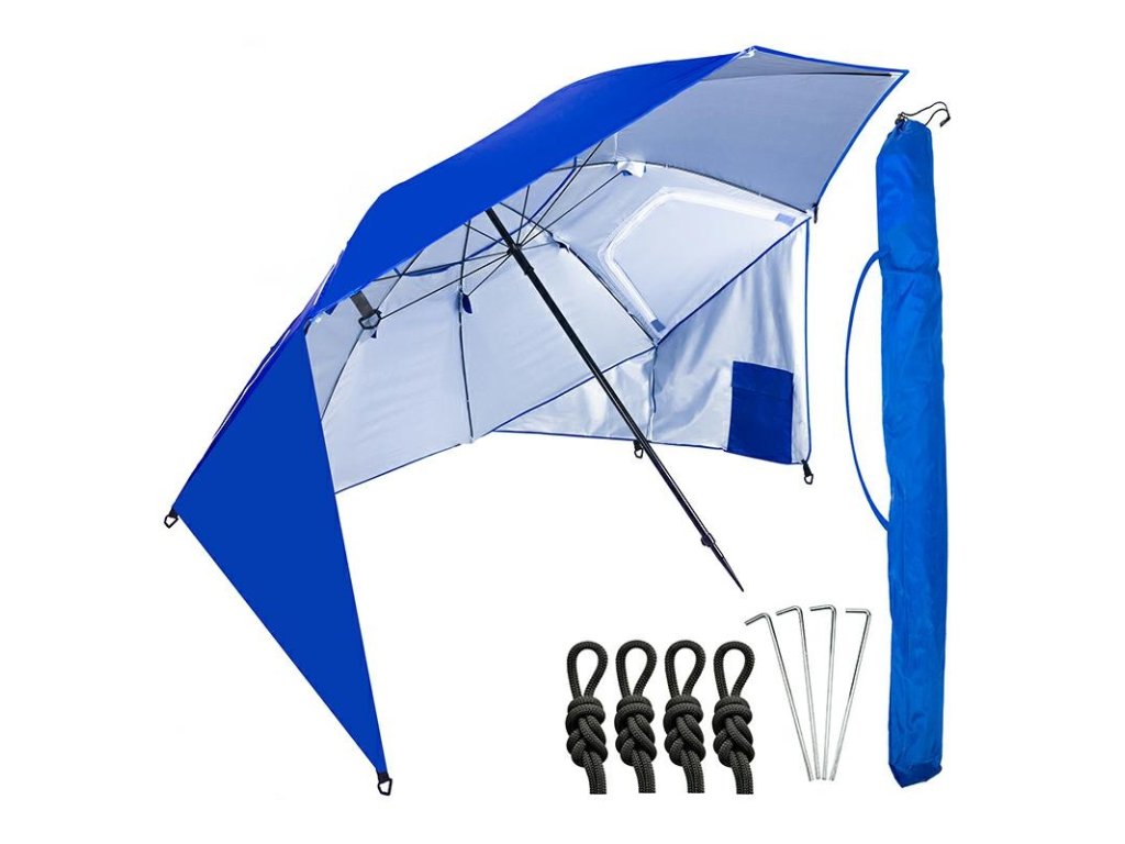 Veľký plážový slnečník s funkciou obrazovky. Stačí rozložiť bočné steny, položiť dáždnik a upevniť kotvami k zemi. Dáždnik má 2 odkryté okná s moskytiérami na zabezpečenie čerstvého vzduchu. Špecifikácia: -materiál: polyester + oceľ -stabilné uchytenie k zemi pomocou kotiev -priemer cez materiál: cca 240cm -priemer: 215cm -celková výška: 125-205cm -teleskopická tyč s bodcom, ktorý umožňuje zapichnúť do brúsený -materiál pokrytý zvnútra materiál s UV filtrom - chráni pred škodlivými účinkami slnečného žiarenia a pred nadmerným zahrievaním - 2 praktické vrecká všité do bočných stien Súčasťou: - dáždnik - obal s madlom na prenášanie - 4 laná o dĺžke 160 cm - 4 kotvy do zeme rozmery dáždnika zloženého v kufri: Množstvo na palete: 150