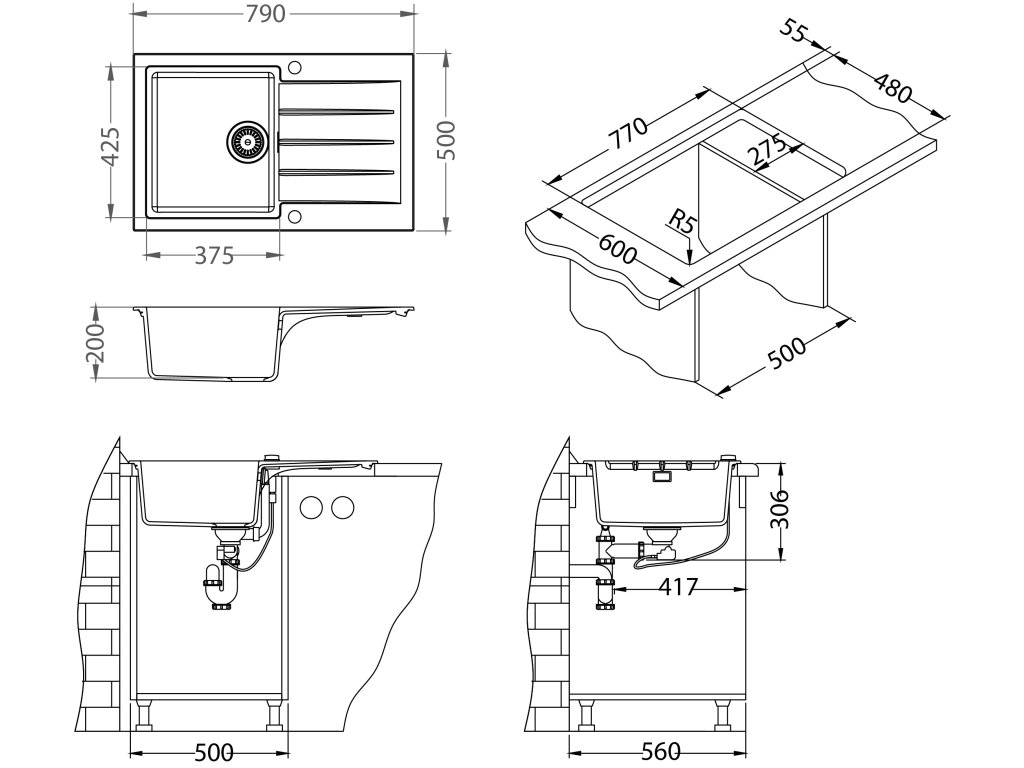 Vestavěný dřez, univerzál. Provedení : granitový dřez s odkapem Vnější rozměr: 790 x 500 mm Rozměr vaničky: 375 x 425 x 200 mm Exentrický sítkový ventil 3 1/2 s přepadem, sifon pro úsporu místa s odbočkou na myčku Úchyty a těsnění pro upevnění dřezu v balení S otvorem pro baterii Návod pro instalaci v obrázcích na obale Instalace do skříňky o šířce 500 mm Váha: 14 kg Rozměr balení (mm): 904x598x263 BATERIE ZEOS-P BLACK Vysokotlaká baterie otočné ramínko rozměr:228x307 mm provedení:chrom černá matná Váha: 1,15 KgDodatočné parametre