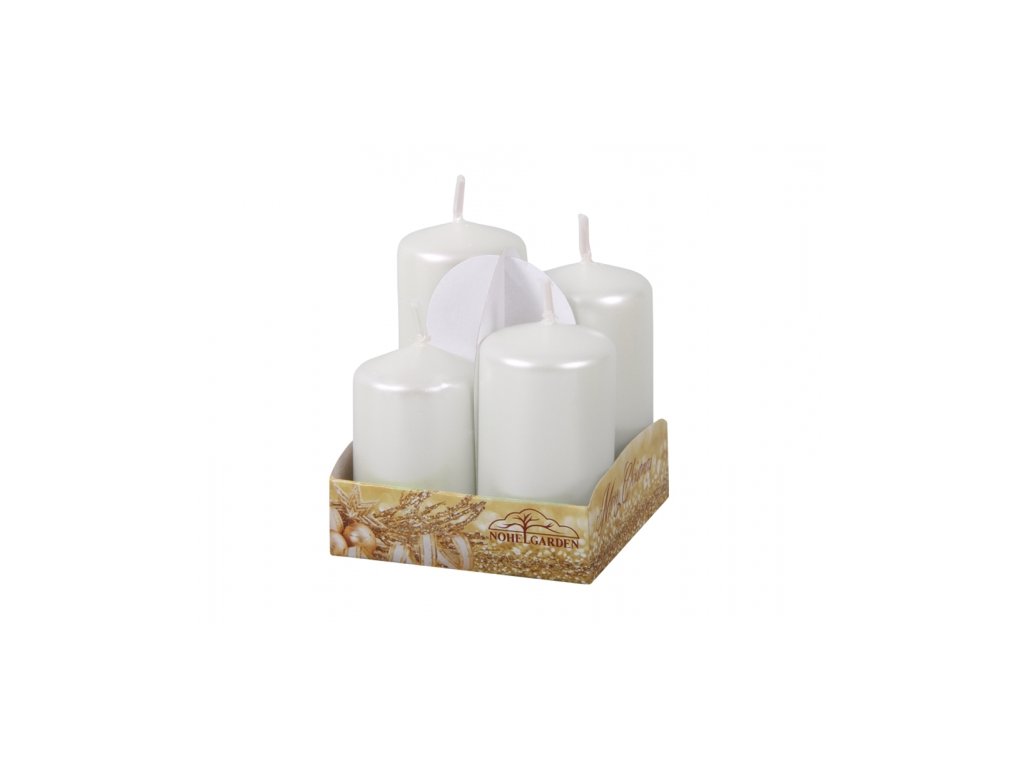 4 adventné lesklé biele sviečky v tvare valca zotriedené podľa výšky. Veľkosť: d4 x 6/7/8/9 cm.Dodatočné parametre