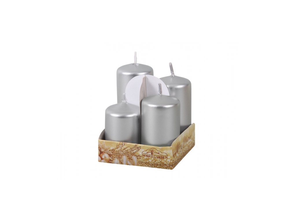 4 adventné lesklé strieborné sviečky v tvare valca zotriedené podľa výšky. Veľkosť: d4 x 6/7/8/9 cm.