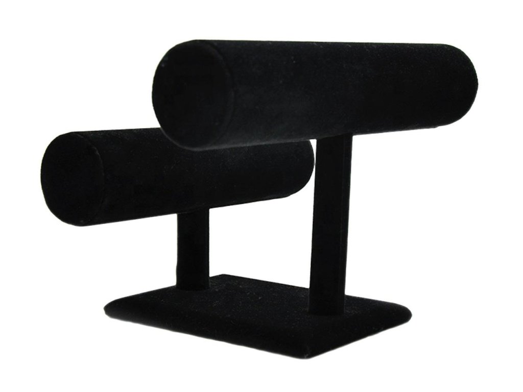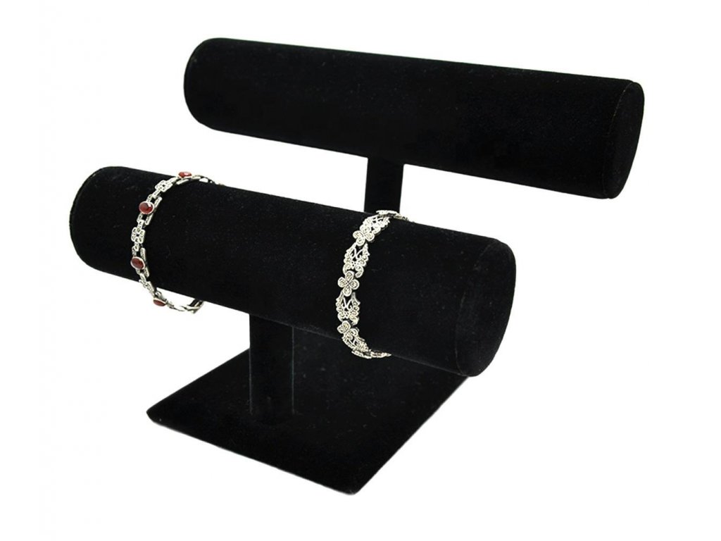 Efektívny a esteticky vyrobený stojan na náramky alebo hodinky, potiahnutý na dotyk príjemnou semišovou látkou.