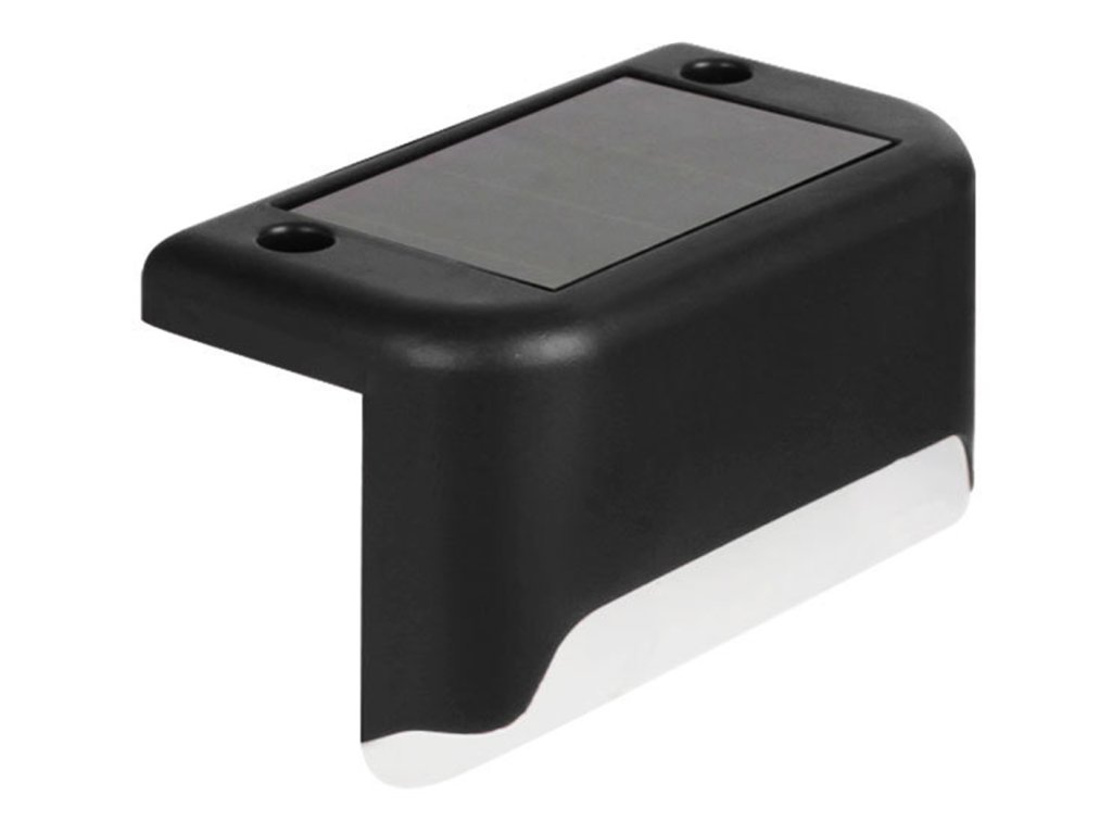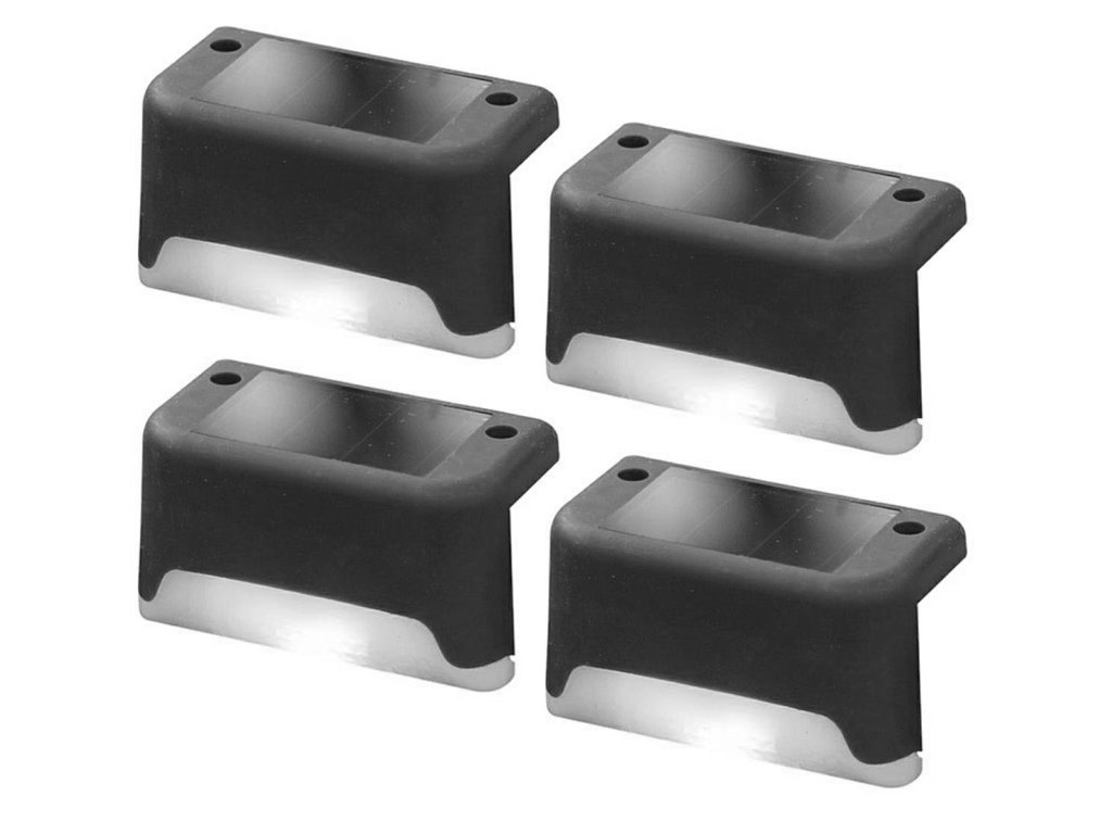 Sada 4 schodiskových lámp napájaných vstavaným solárnym panelom. Každá zo svietidiel má vstavanú batériu dobíjanú slnečným žiarením, nevyžadujú ďalšie napájanie. Vybavené jasnými, studenými bielymi LED. Lampy majú súmrakové senzory, ktoré po zotmení automaticky rozsvieti LED. Veľmi jednoduchá inštalácia – súčasťou je montážny hardvér.