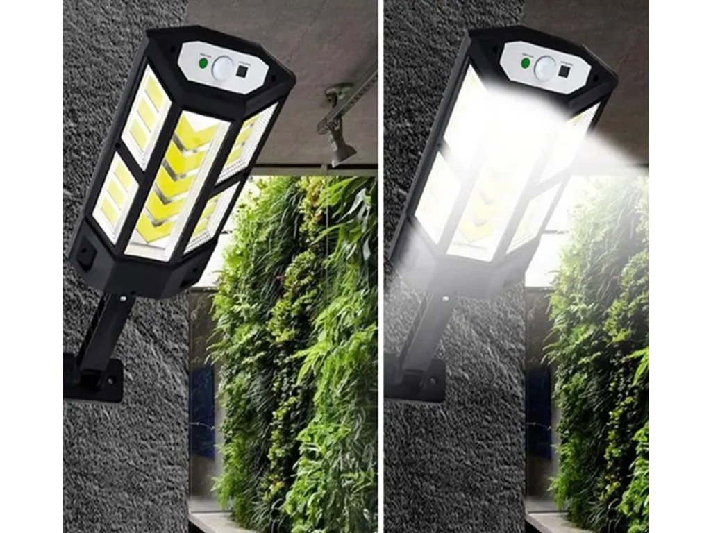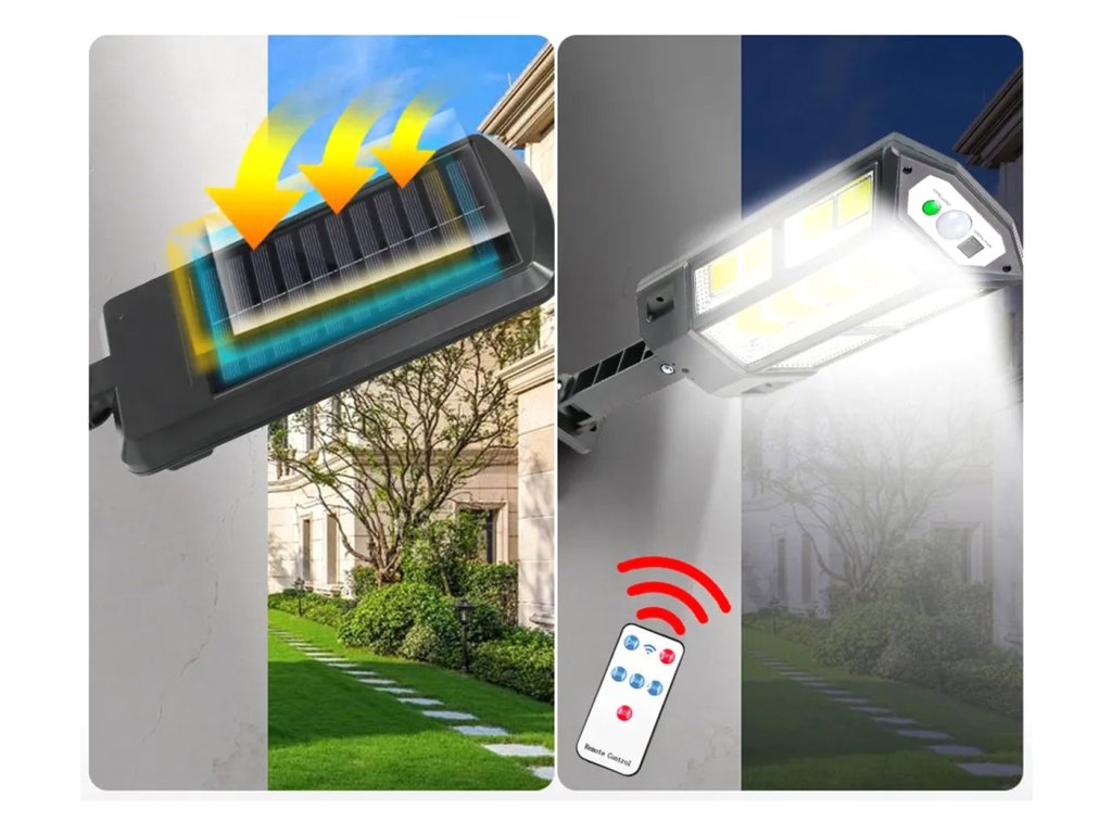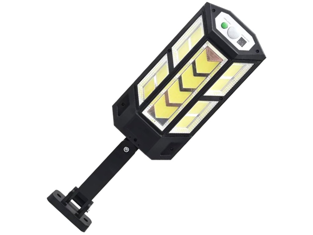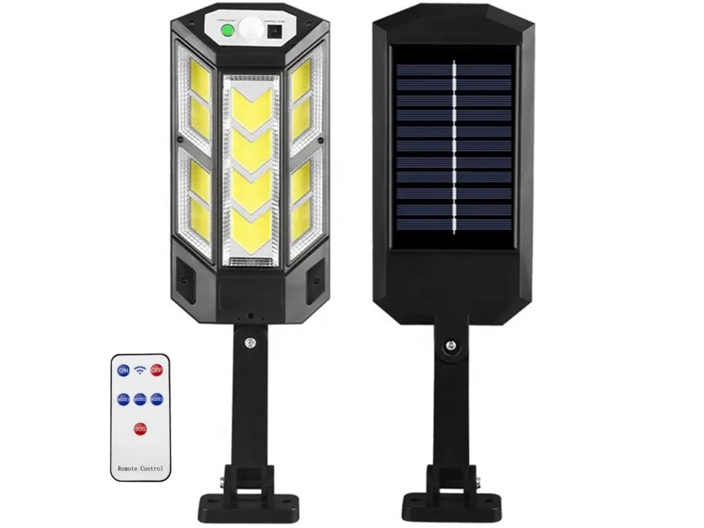 Závesná solárna LED lampa s IR diaľkovým ovládaním. Nastaviteľná rukoväť na spodnej strane umožňuje jednoduchú montáž lampy na plot, strechu alebo fasádu budovy. Vstavaný súmrakový a pohybový senzor rozsvieti lampu iba za súmraku a pri detekcii pohybu, čo zvyšuje úsporu energie. Vybavené jasnými a energeticky úspornými 124 COB LED, napájanými vnútornou batériou nabíjanou zo solárneho panelu. Nastavenie uhla sklonu v dvoch bodoch umožňuje nasmerovať prúd svetla požadovaným smerom. Nevyžaduje ďalšie zdroje energie. IR diaľkové ovládanie umožňuje pohodlné ovládanie lampy.