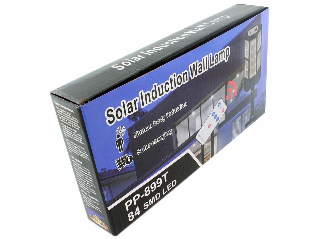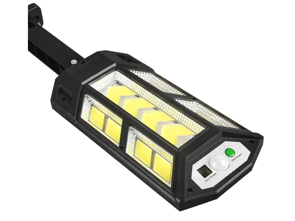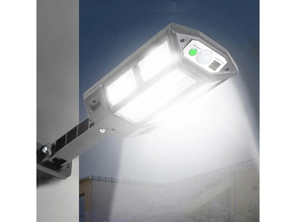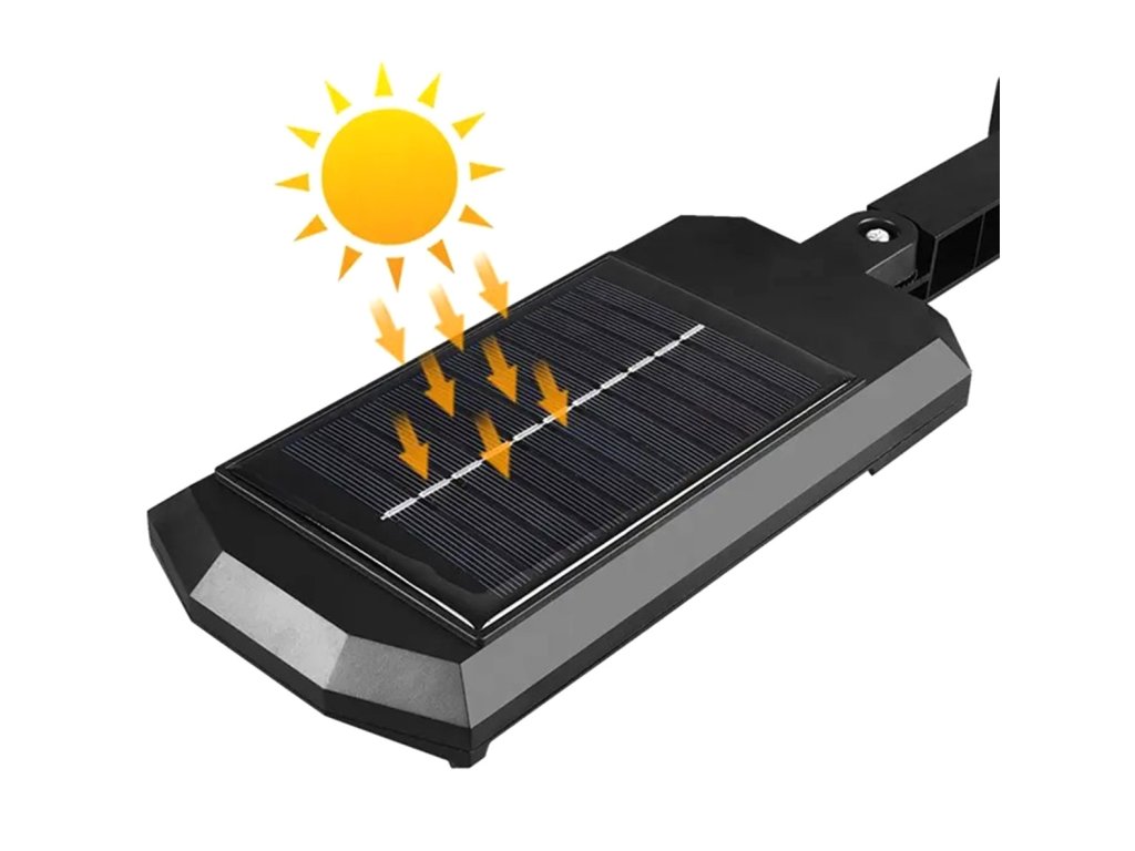 Závesná solárna LED lampa s IR diaľkovým ovládaním. Nastaviteľná rukoväť na spodnej strane umožňuje jednoduchú montáž lampy na plot, strechu alebo fasádu budovy. Vstavaný súmrakový a pohybový senzor rozsvieti lampu iba za súmraku a pri detekcii pohybu, čo zvyšuje úsporu energie. Vybavené jasnými a energeticky úspornými 124 COB LED, napájanými vnútornou batériou nabíjanou zo solárneho panelu. Nastavenie uhla sklonu v dvoch bodoch umožňuje nasmerovať prúd svetla požadovaným smerom. Nevyžaduje ďalšie zdroje energie. IR diaľkové ovládanie umožňuje pohodlné ovládanie lampy.